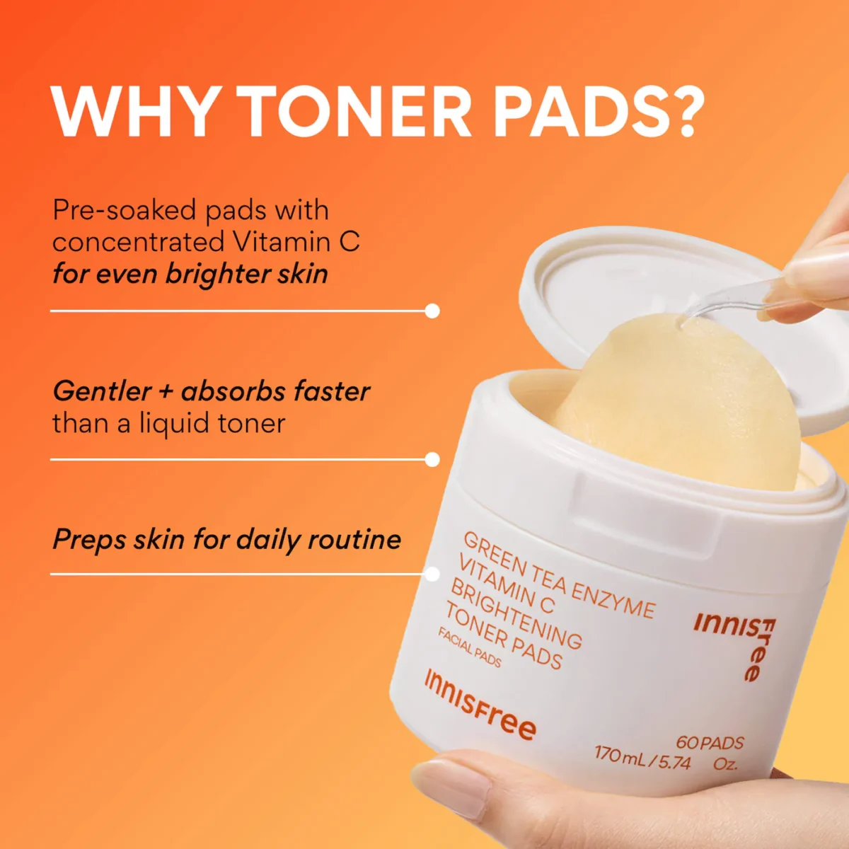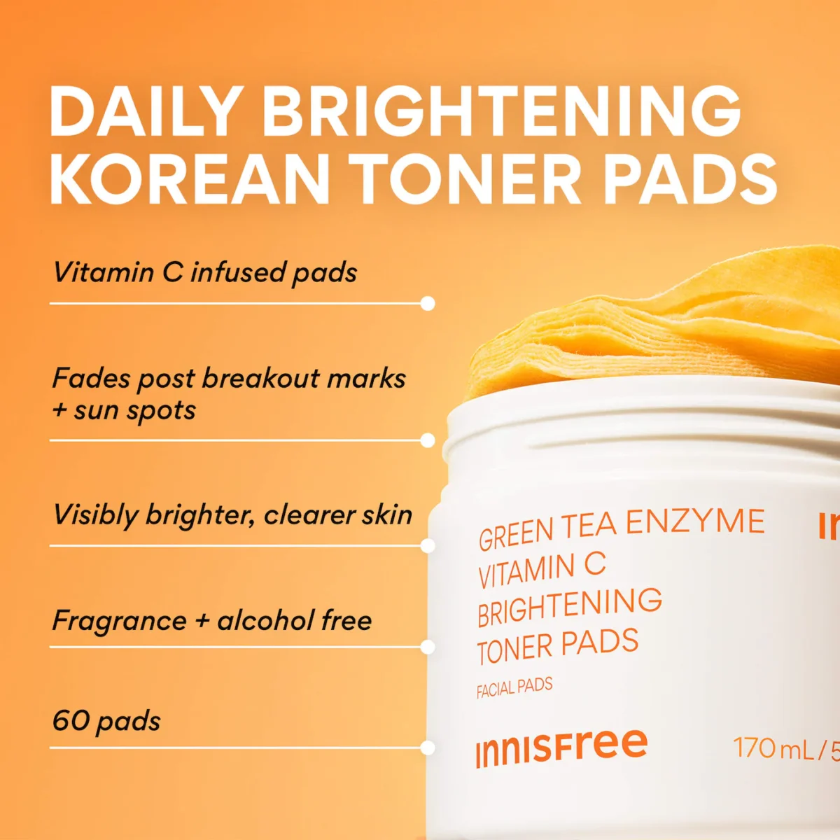 A set of daily toner pads with vitamin C and green tea enzyme to visibly brighten skin and fade dark spots like post-breakout marks and sunspots.