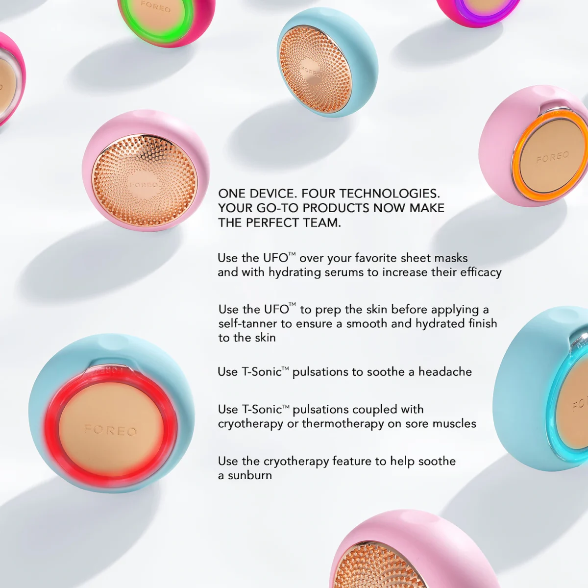 A skincare-enhancing device featuring thermotherapy, cryotherapy, T-Sonic pulsations, and eight LED lights to enhance the efficacy of serums and face masks.